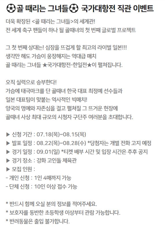 오늘은 예능과 스포츠의 경계를 허물며, 축구에 대한 관심을 높이고, 더욱 많은 사람들이 여성 스포츠에 관심을 가지도록 하는 데 큰 역할을 하고 있는 '골 때리는 그녀들 - 세계관의 확장' 한일전 직관 이벤트 신청방법에 대해 알아 보았습니다.