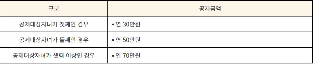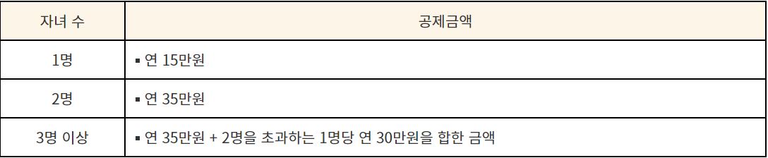 - 종합소득이 있는 거주자의 기본공제대상자에 해당하는 자녀(입양자 및 위탁아동을 포함하며 이하 "공제대상자녀"라 함) 및 손자녀로서 8세 이상의 사람에 대해서는 자녀의 수에 따라 다음의 금액을 종합소득산출세액에서 공제합니다.