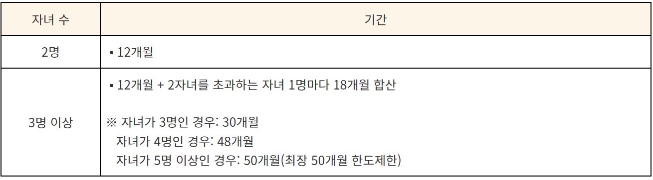 - 자녀가 2명 이상인 국민연금 가입자 또는 가입자였던 사람이 노령연금수급권을 취득한 경우(「국민연금법」 제19조에 따라 가입기간이 추가 산입되면 노령연금수급권을 취득할 수 있는 경우를 포함)에는 최장 50개월을 한도로 다음과 같은 기간이 국민연금 가입기간에 추가로 산입됩니다.