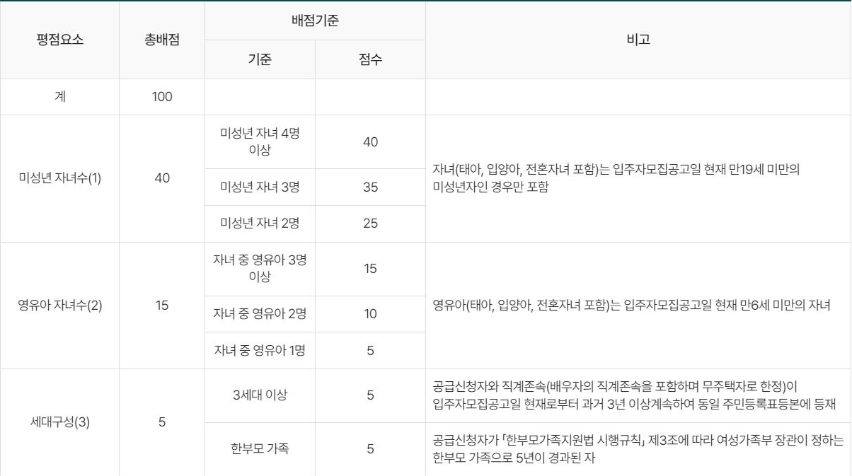 - 경쟁이 있는 경우 "다자녀가구 특별공급 우선순위 배점표"에 의한 점수 순 동일점수로 경쟁 발생 시