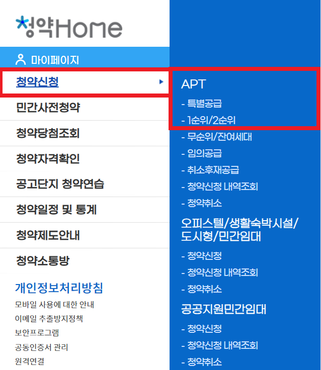 1. 청약홈 홈페이지 좌측 상단 마이페이지- 청약신청