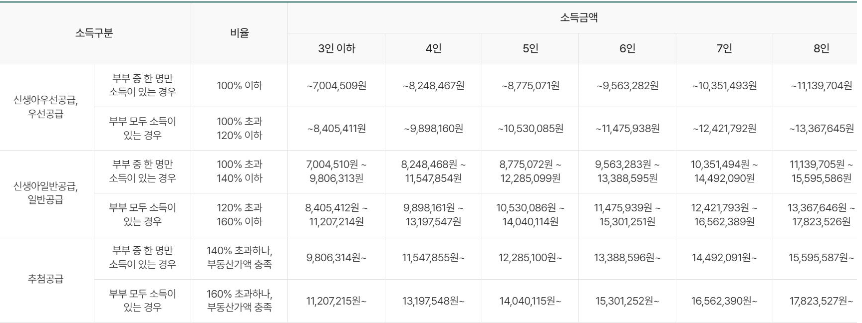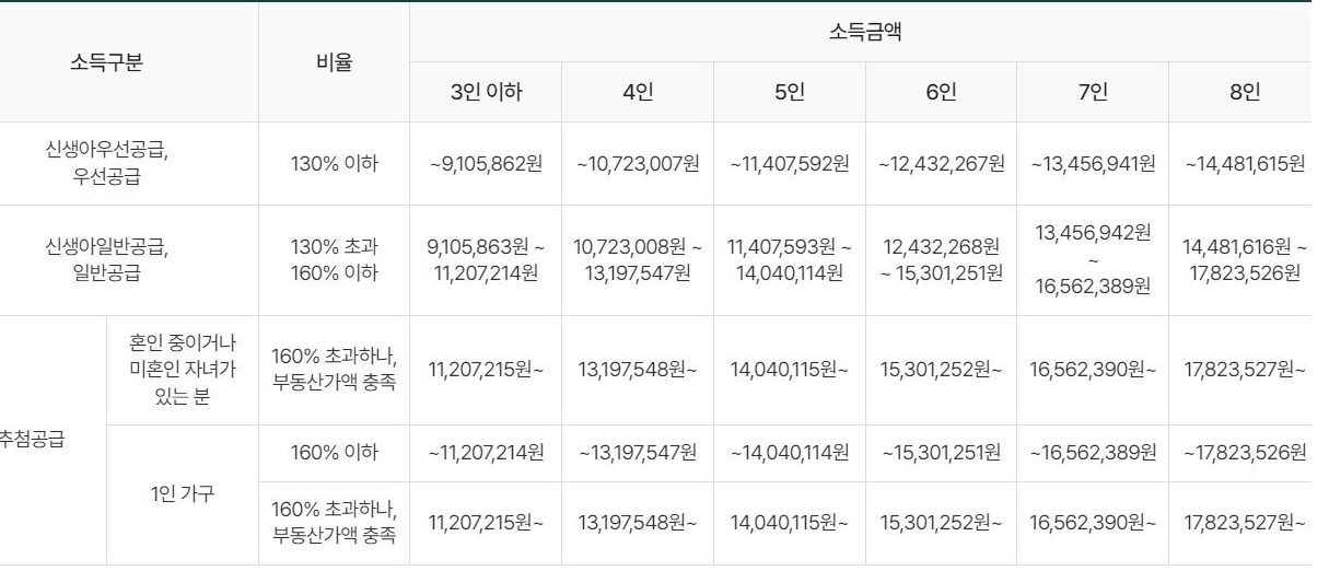 - 위 소득기준은 초과하나, 해당 세대 소유 부동산(토지 및 건물)의 합계액이 3.31억 이하인 경우 순위 없는 추첨제(30%) 자격으로 신청가능