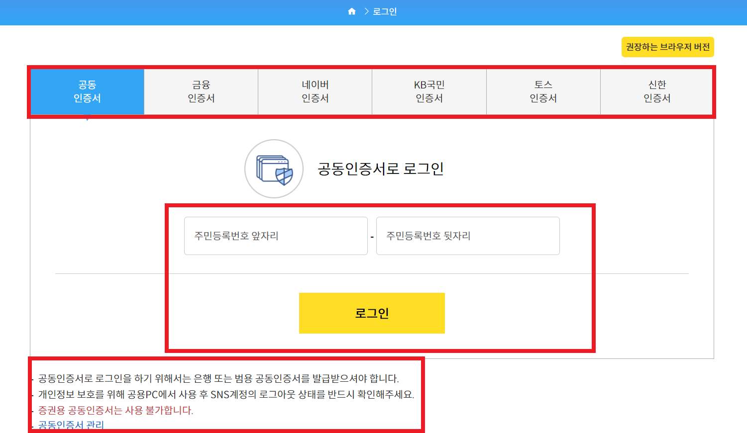 4. 소유하고 있는 인증서를 선택하고 로그인