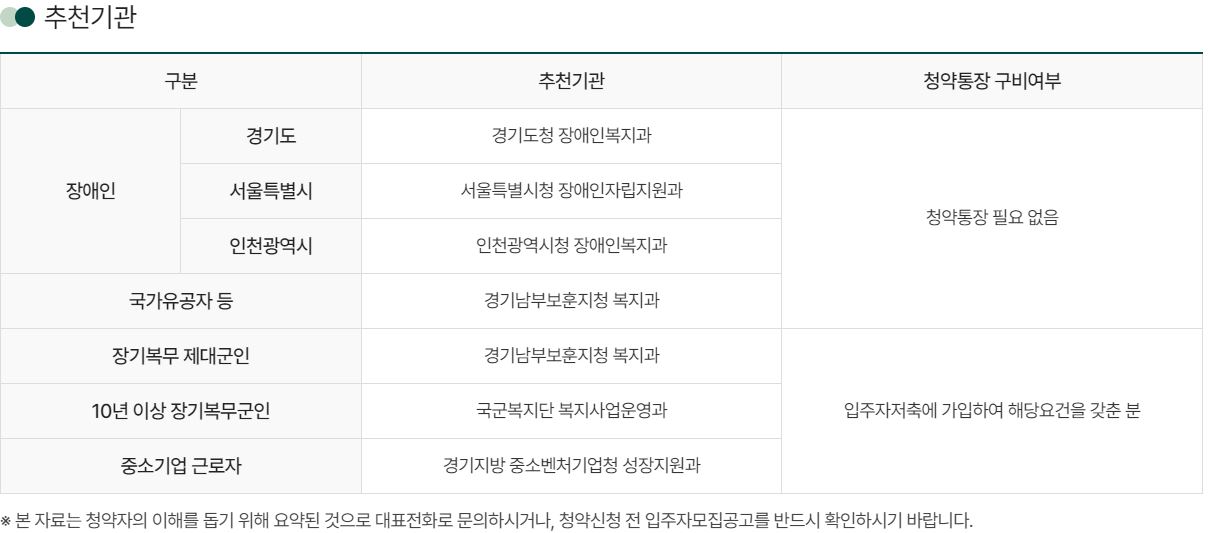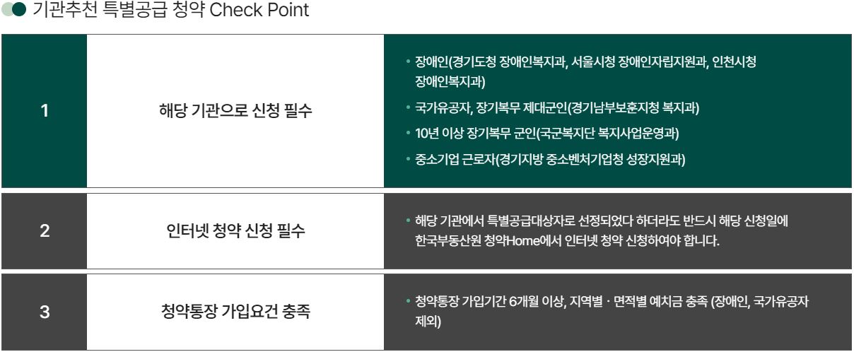 - 기관추천 특별공급의 경우 자격요건을 갖춘 자는 먼저 해당기관에 신청하여야 합니다.
