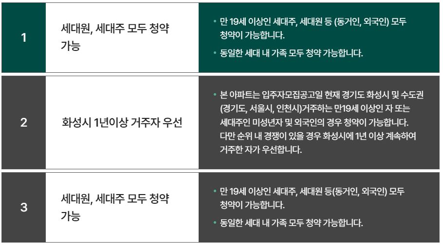 - 입주자모집공고일 현재 화성시에 거주하거나 수도권(서울특별시, 인천광역시, 경기도) 지역에 거주하는 만 19세 이상인 자 또는 세대주인 미성년자