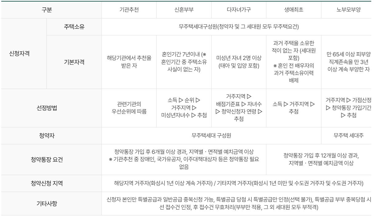 ※노부모부양 특별공급은 무주택세대주만이 신청할 수 있으며(세대구성원은 청약불가) 피부양자의 배우자도 무주택이어야 함 - 만 65세 이상의 직계존속(배우자의 직계존속 포함)을 3년 이상 계속하여 부양하고 있는 세대주 ※같은 세대별 주민등록표등본에 등재해야 함