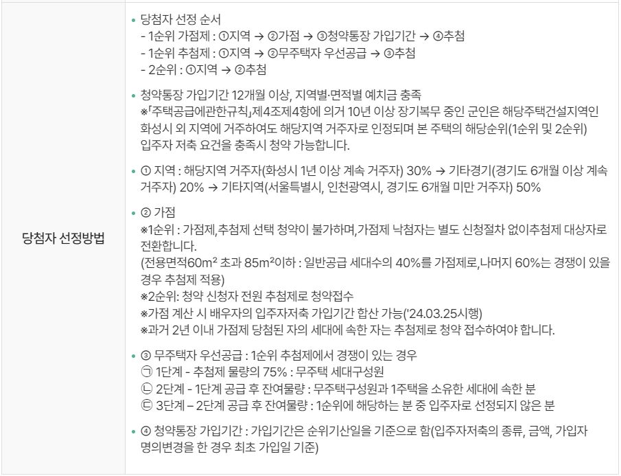 - ① 지역 : 해당지역 거주자(화성시 1년 이상 계속 거주자) 및 기타 경기 거주자(경기도 6개월 이상 계속 거주자) 50% → 기타 지역 거주자(경기도 6개월 미만 및 서울특별시·인천광역시 거주자) 50%