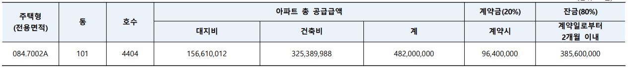 | 무순위 일반(전국) | 84A | 101-4404 | 4.82억 | 999만원 | - |