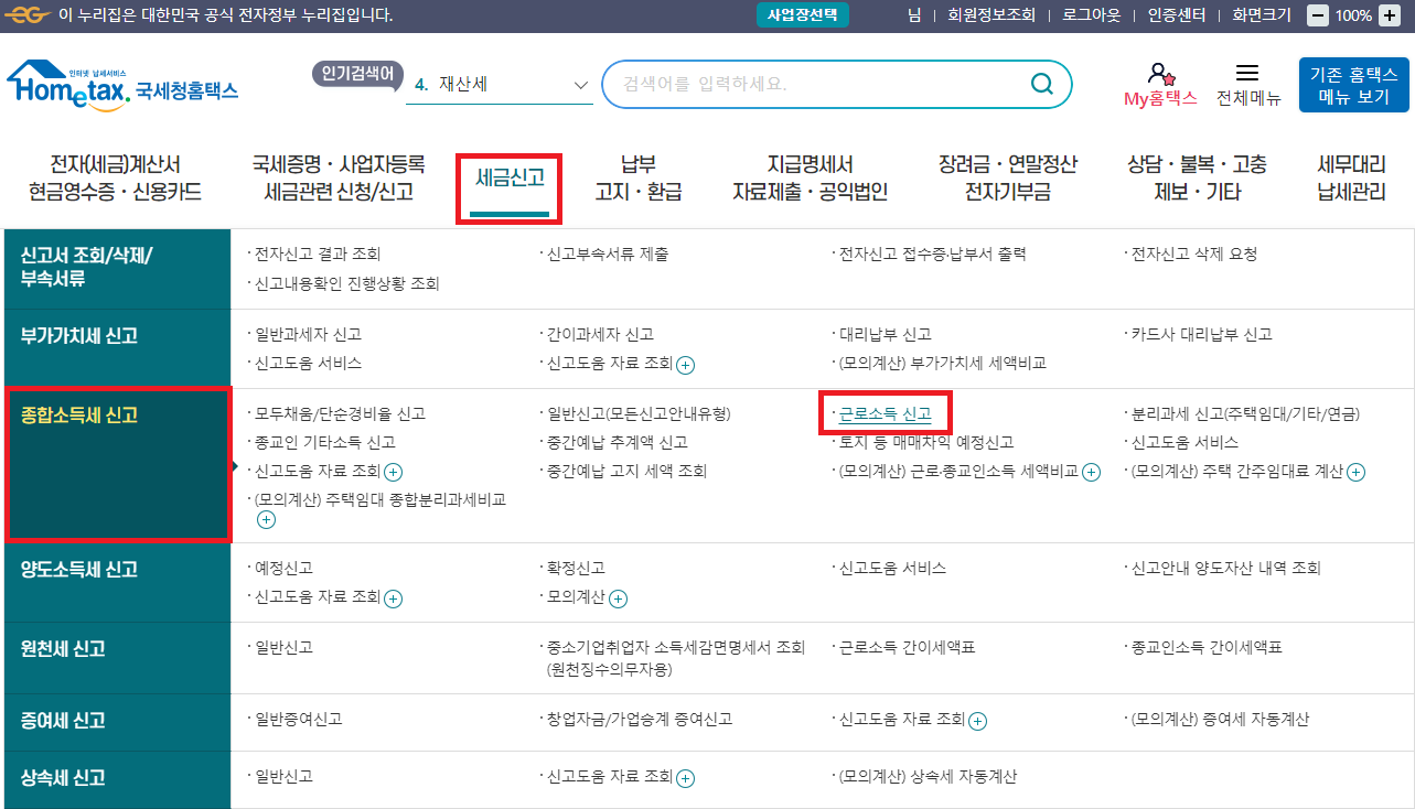 - 좌측 사이드에 근로소득 신고 선택