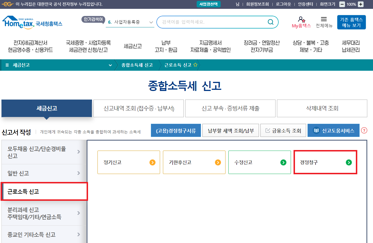 - 우측 경정청구 선택