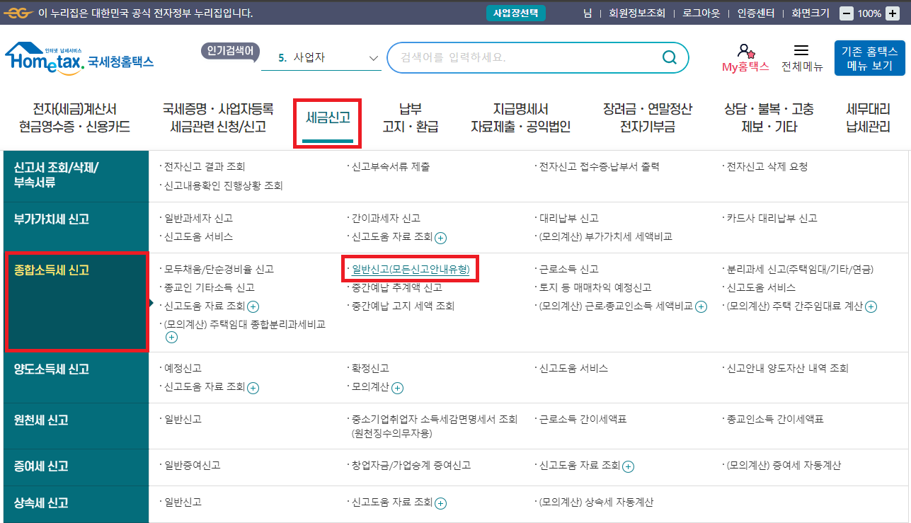 - 좌측 사이드에 종합소득세 신고 선택