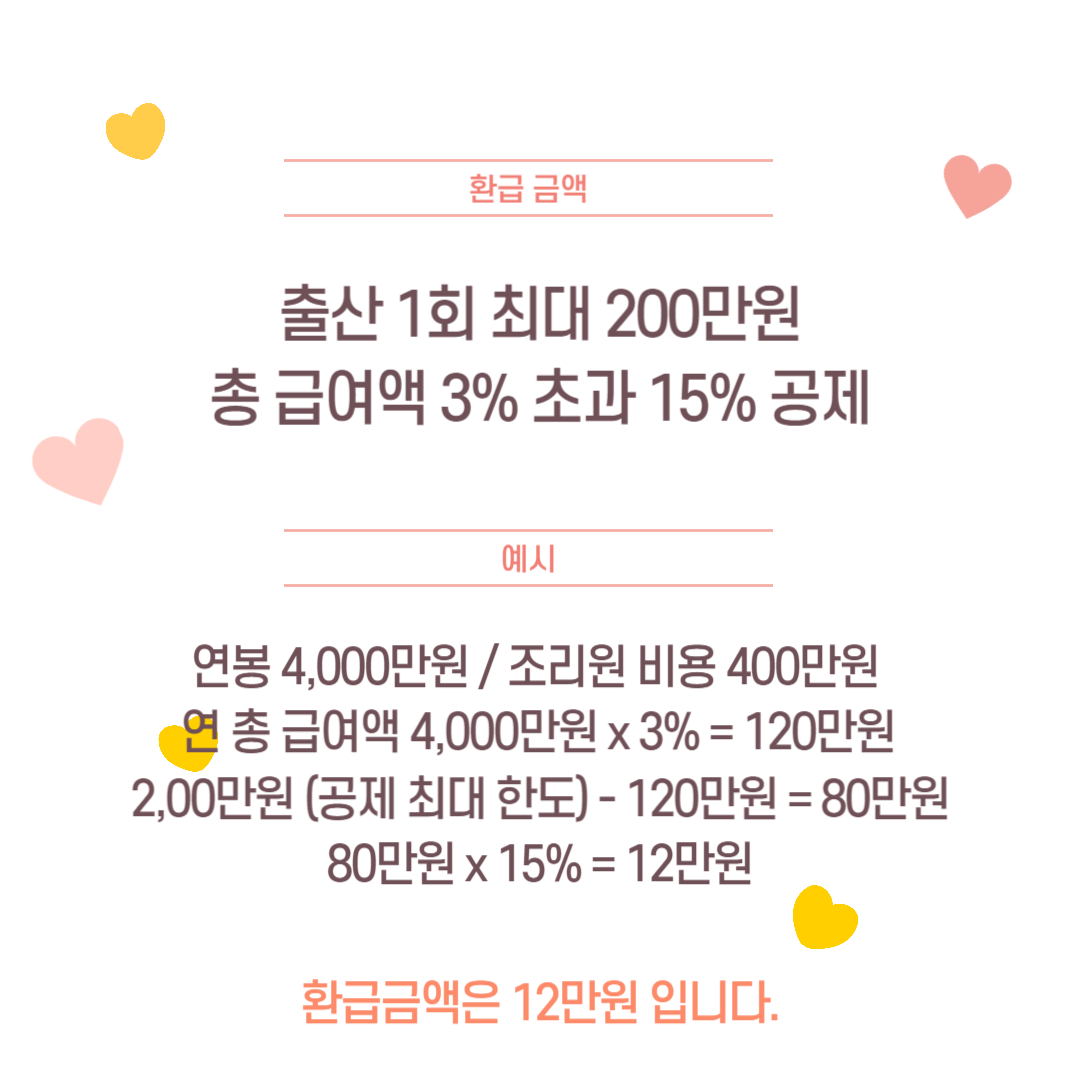 - 출산 1회당 최대 200만원 한도 까지 환급받을 수 있으며,