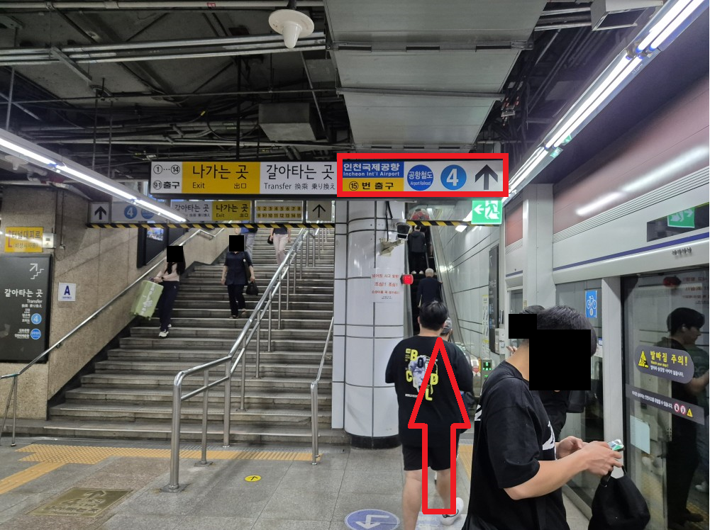 하차 후 바로 인천국제공항, 15번 출구, 공항철도 4호선 이정표 방향으로 보이는 에스컬레이터를 탑승