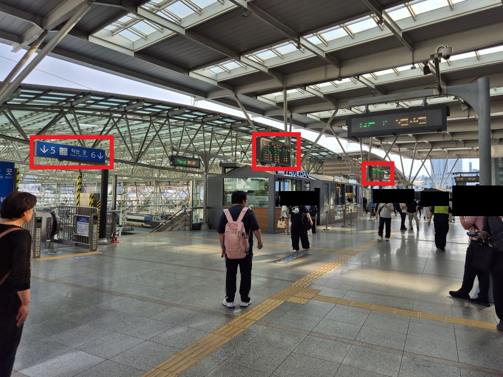 빨간색으로 표시된 부분이 타는 곳 안내 표지판과 열차 시간표 입니다.