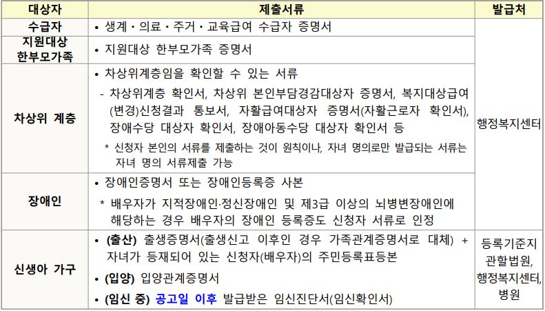 ※ 수급자, 지원대상 한부모가족(한부모가족 증명서), 차상위계층은 금융정보 등 제공 동의서, 자산 보유사실 확인서 제출 불필요(예비신혼부부는 제출)
