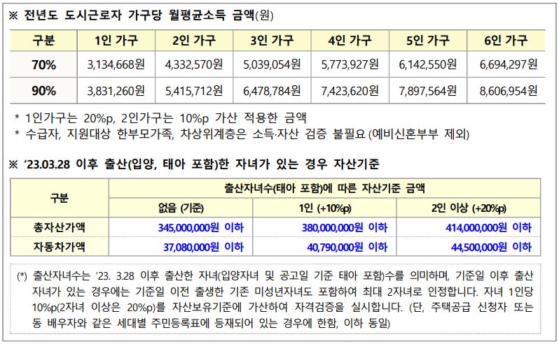 * ’23.03.28 이후 출산(입양, 태아 포함)한 자녀가 있는 경우, 자녀 1인당 자산요건 10%p 완화(최대 2자녀 20%p)