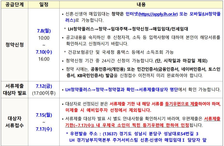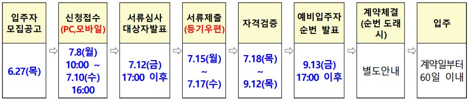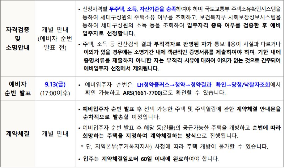 * 사회보장정보시스템(복지부 산하기관)을 활용한 소득 및 자산 조회 일정 지연, 소명대상자 발생 등의 사유로 일부 지역본부(주거복지지사)에서는 예비자 순번 발표 및 이후 일정이 지연될 수 있습니다.