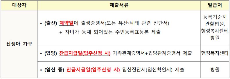 ※ 태아 또는 입양한 자녀를 인정받아 입주자로 선정된 자는 관련 서류를 제출하지 않거나 「모자보건법」 제14조를 위반하여 인공 임신중절수술 등을 하거나 입주 전 파양한 사실이 판명되는 때에는 계약이 취소됩니다.