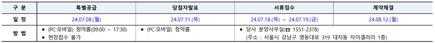 - 공급규모 : 공공분양주택 지하 2층 ~ 23층 11개동 전용면적 85㎡ 이하 360세대 중 계약취소주택 8세대 [특별공급 8세대(신혼부부 3세대, 생애최초 3세대, 노부모 2세대)]