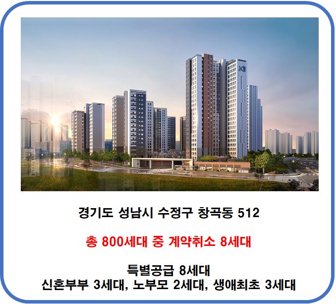 360세대 중 계약취소 주택 8세대[특별공급 8세대 (신혼부부 3세대, 노부모 2세대, 생애최초 3세대)]