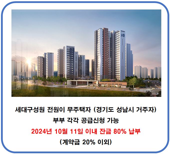 - 청약자 본인은 해당 주택건설지역(경기도 성남시)에 거주해야 하며, 본인 및 배우자 그리고 그 세대를 구성하고 있는 세대구성원 전원이 무주택자여야 합니다.
