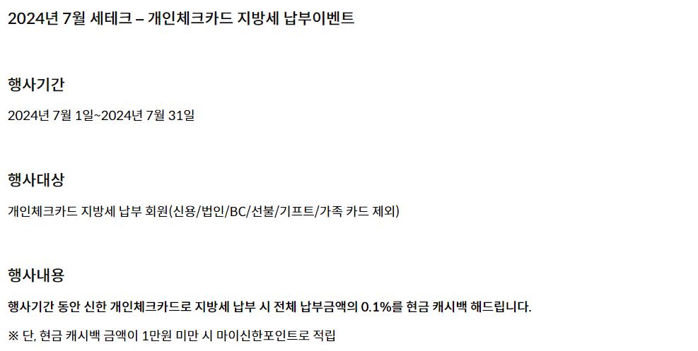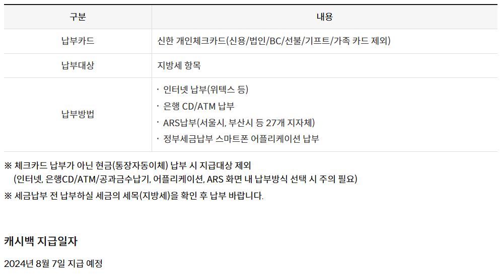 신한체크카드 0.1% 현금 캐시백(세테크 지방세 납부 이벤트)
