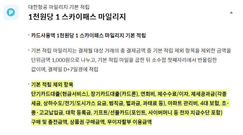 - 기본적립 제외 항목을 살펴보면 제세공과금 (각종세금)은 마일리지 적립이 제외라고 되어 있습니다.