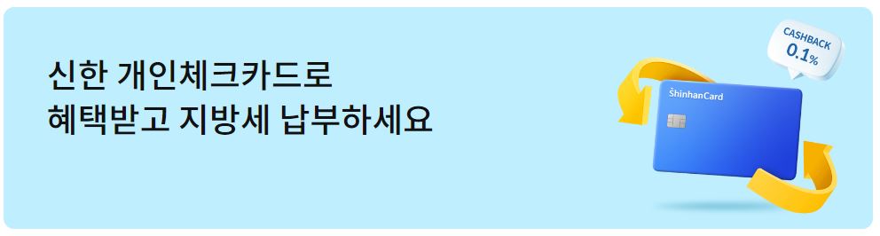 - 신한카드에서는 개인이 소지하고 있는 체크카드로 지방세를 납부 시