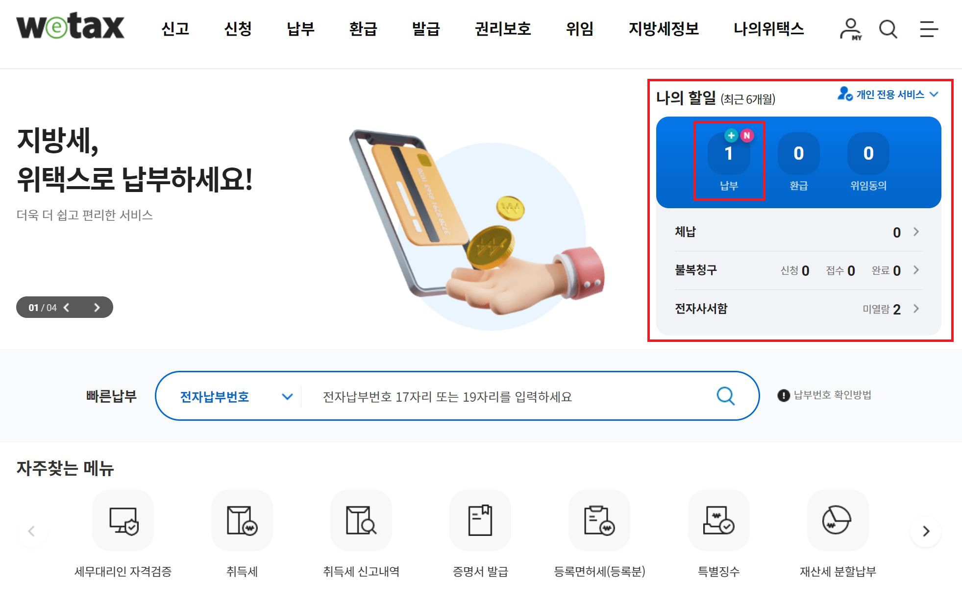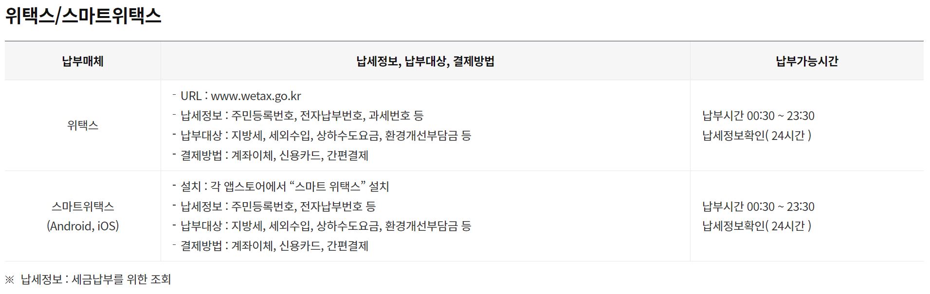 - 모바일 납부 : 행안부 스마트 위택스 앱을 통해 납부
