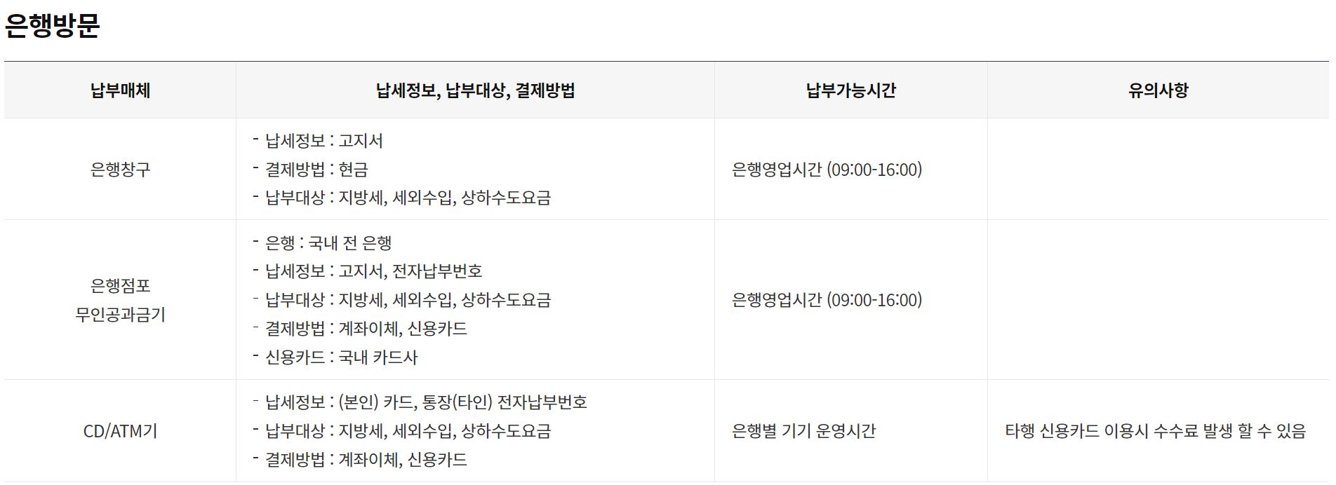 - 은행창구 납부 : 전국 은행, 우체국 새마을금고, 신협은행, 저축은행 등