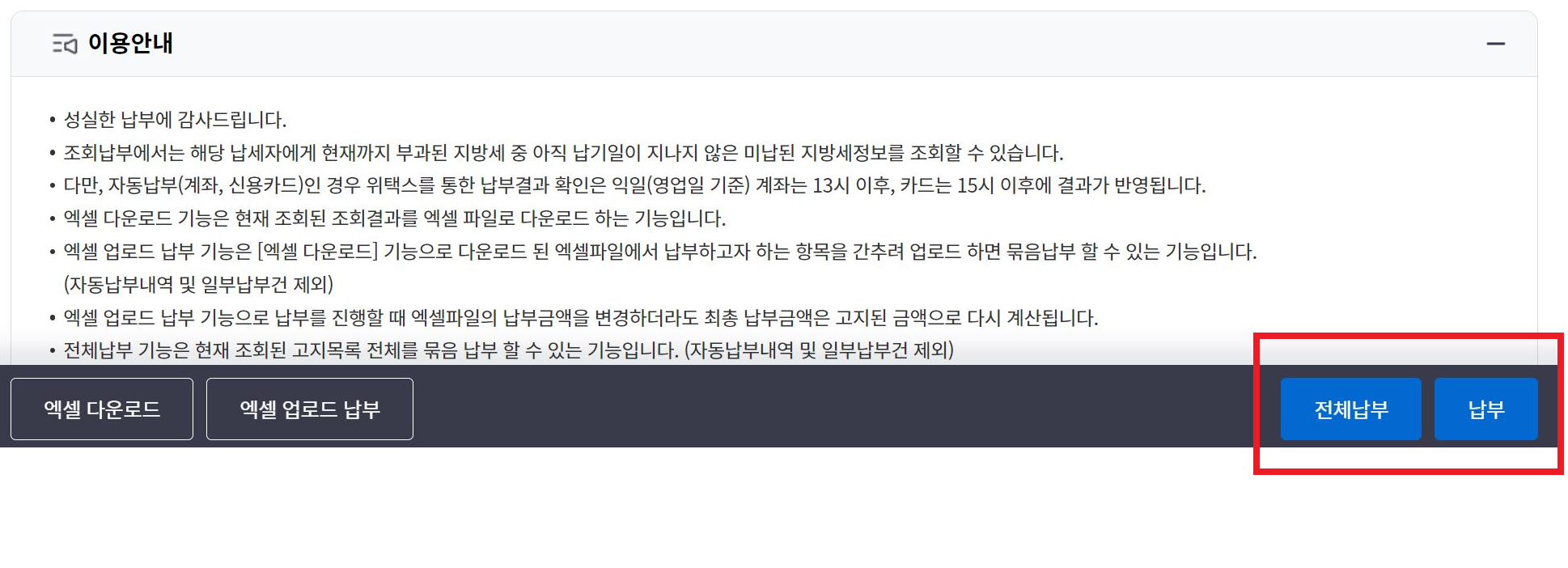납부 방법을 선택하신 후 납세정보를 확인하셔서 불편 없이 이용하시기 바랍니다.