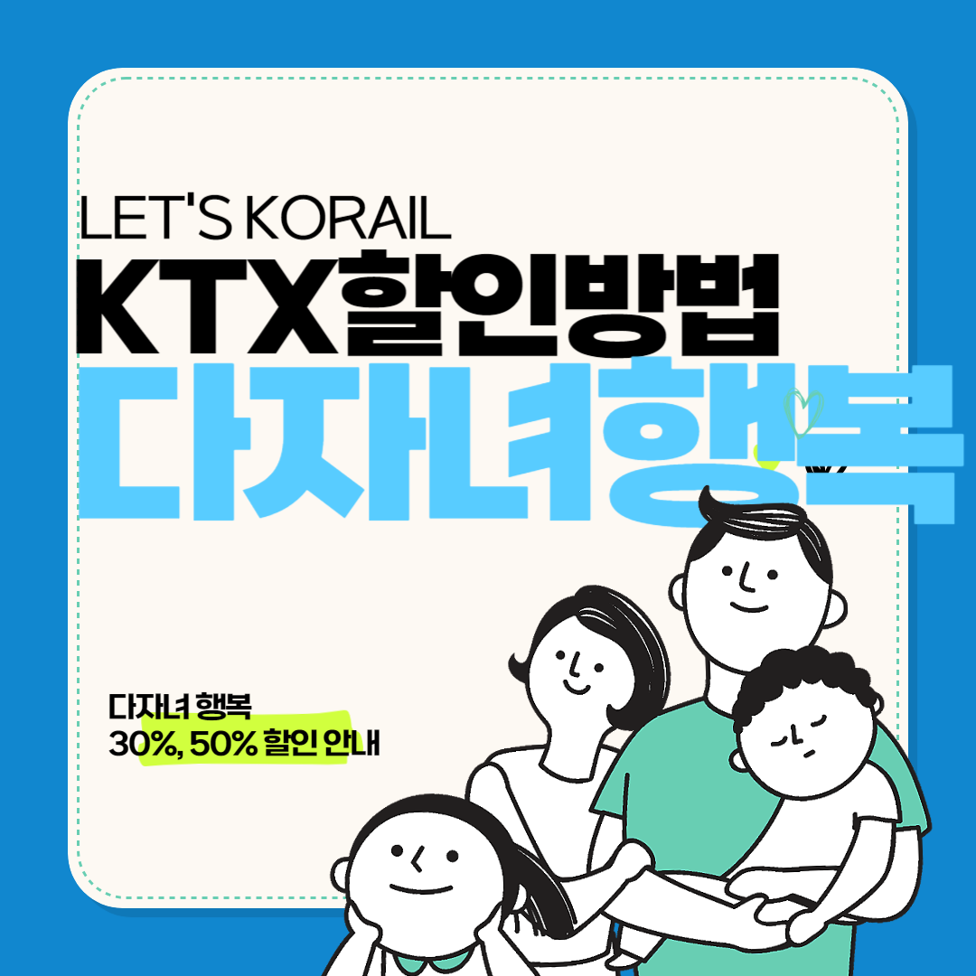코레일에서는 5월 30일부터 자녀가 셋 이상인 가족이 KTX를 반값(50%, 2자녀 가정은 30%) 에 이용할 수 있도록 '다자녀 행복' 할인 폭을 확대하였습니다. 다자녀 혜택을 받으려면 사전에 온라인 또는 오프라인으로 인증을 받아야 합니다.