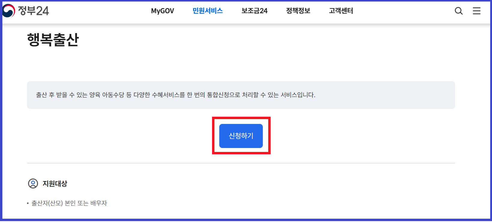 - 다만, 다자녀행복 가족정보 온라인에서 인증이 되지 않은 경우(가족구성원이 주소를 달리하거나, 주민등록등본상 표시되지 않을 경우 등)는 가까운 읍면동 행정복지센터를 방문하여 출산서비스 통합처리 신청서를 통해 신청하여 주시기 바랍니다.