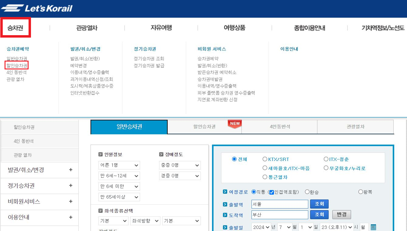 1. 좌측 상단 승차권 선택하여 승차권예약에 할인승차권 선택
