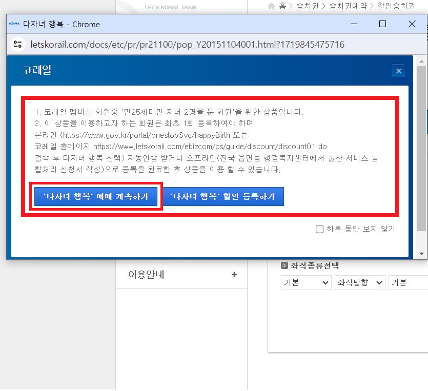 5. 안내사항 확인 후 '다자녀 행복' 예매 계속하기 선택