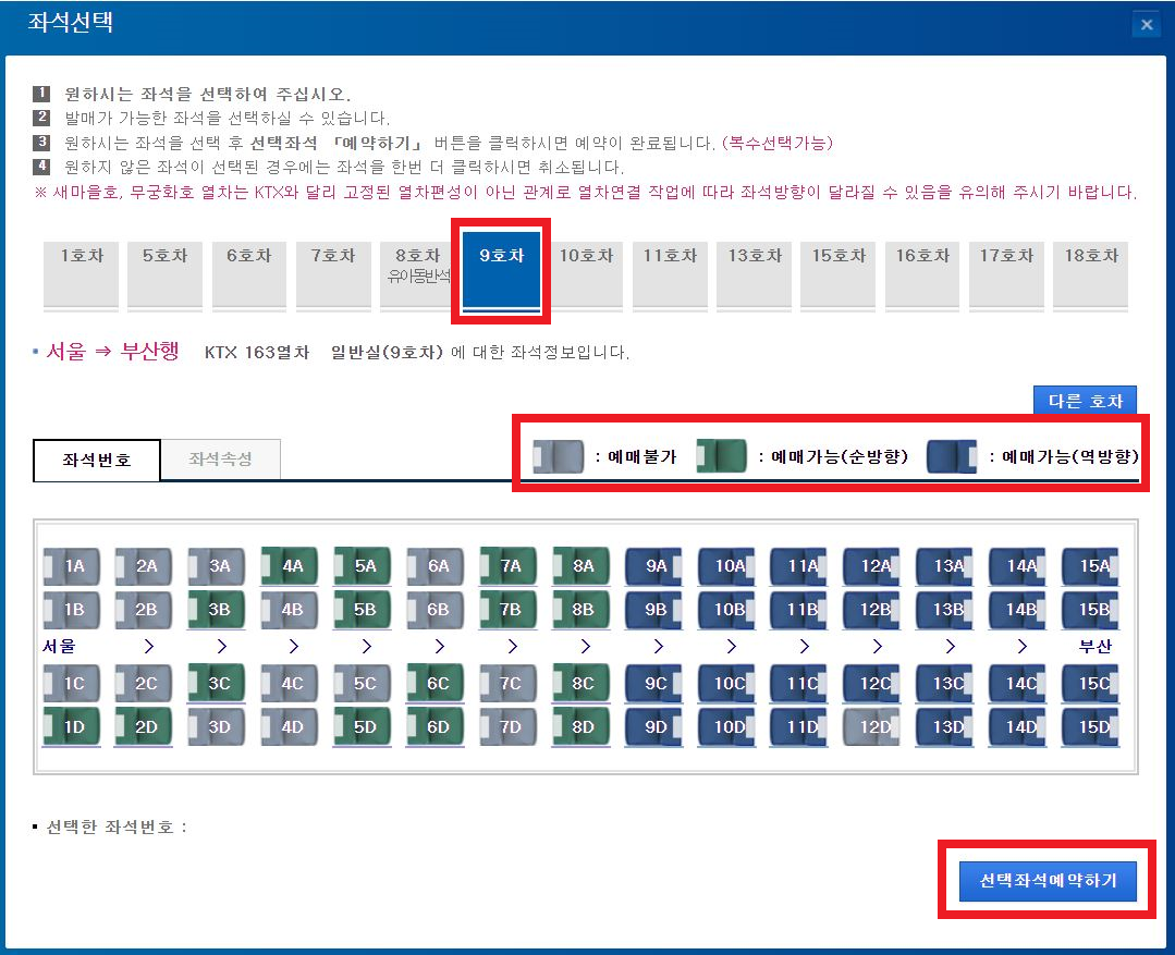 8. 좌석 부분에 초록색인 경우에만 좌석 선택이 가능하며, '다른 호차' 탭을 이용하여 호차를 변경할 수 있습니다.